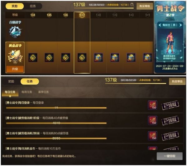在开通680档位的前提下,每日完成日常任务,每周可获得6200经验值。完成赛季任务后,仅需五周即可达到满级并领取最终奖励,后续成长过程中还可领取多个礼包。