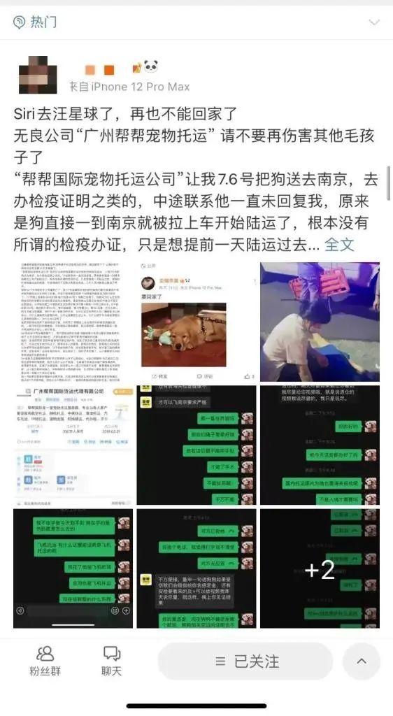而陈女士在社交平台的爆料博文中配的几张聊天截图也显示,事发后,陈姓工作人员称,帮帮宠物旅行社承认最大过错方是该公司,经内部商讨后给出两个解决方案,重新买一只金毛赔偿给Siri主人或赔偿六千元,如果Siri主人认为赔偿金额不如预期,双方可继续商讨;如其坚持走法律程序,该公司也将以“辱骂”、“骚扰”等理由对其进行反告。