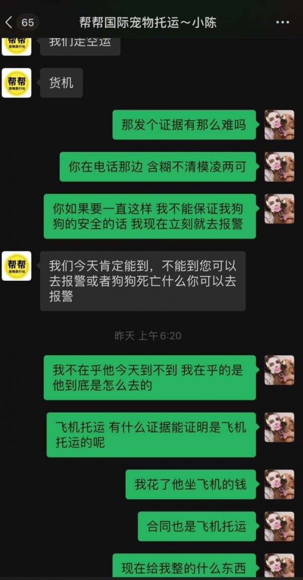 按照双方的计划,狗应该是7月7日晚上9点多的飞机出发,但托运机构表示空运需要办理相关手续,要求6日早上去接狗狗,理由是南京疫情防控问题还要去海关检查狗狗的健康问题。