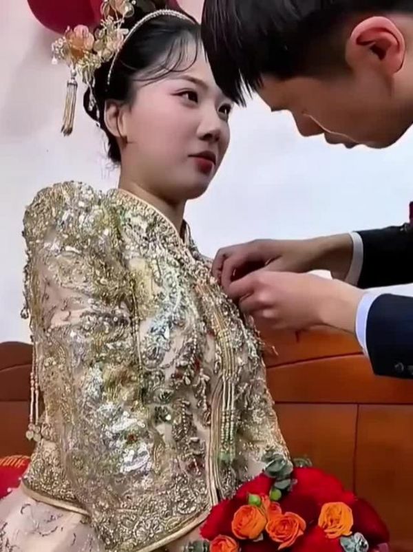 新郎给新娘佩戴胸花,爱意满满