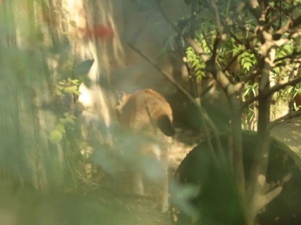 小土坡的高度和位置选择刚刚好,土坡距离北墙之间有一条隐蔽的小路,我们在游客参观区望向里面,猞猁在小路上,随着步伐的节奏,我们可以看到猞猁若影若现的背脊,这种距离感就像在看河对面那位轻纱罩面的女子漫步在杨柳之间,既神秘又美好。