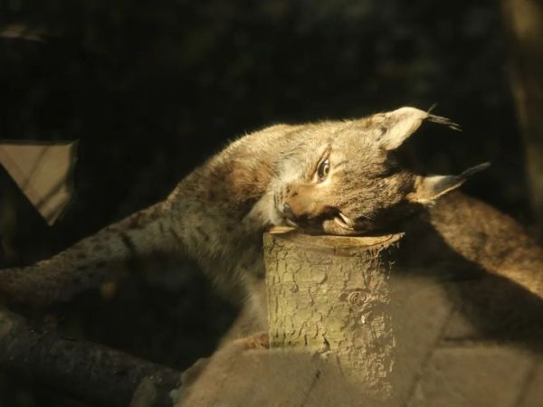 相信我,栖架区是最妙的。猞猁可以从任何角度跳上栖架平台,有的一米左右,有的超过两米,这非凡的跳跃能力只有在这里看起来才会那么的赏心悦目、不受约束。平台木料的选择也是考究的,多是未修整的原木,伸个懒腰轻轻的抓一下,爪尖或许还能从树皮里带出有清香味的绿液。