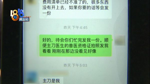 小罗说,总得知道手术费用是多少钱,才能确定自己付的2800块钱是不是手术费的一半。她提供了聊天记录,宠物医院的胡院长回复她说,等会儿发一份。之后小罗又希望看一下胡院长的兽医资格证,一位丁医生出来表示,主刀的是她,胡院长只是在旁边当助手。