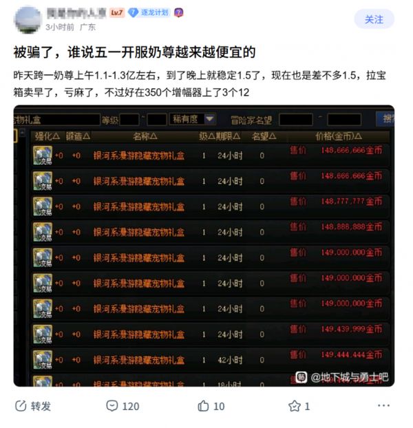 冒险家发帖称本以为按照往年惯例,五一套开服后奶尊宠物价格会随着礼包大量上架而越来越便宜,于是在上午以1.1-1.3亿的价格把奶尊宠物匆匆抛售。结果到了晚上,跨一奶尊价格直接稳定在1.5亿,至今也没回落。卖早亏麻的他只能自我安慰:好在350个增幅器成了3个红12。这帖一出,瞬间引爆话题。