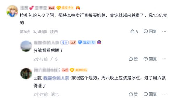 部分冒险认为后期会降价。也有冒险家预测按照趋势周六晚上可能是冰点,过了就得涨,理由是面临打团可能会有大批冒险家直接拍卖拉奶尊,这部分玩家敏锐地意识到:拉礼包的人少,奶尊产出越低,价格只会越来越硬。结论是市场价格只看供需。