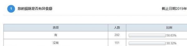 共有498名有效选民,292人的猫有异食癖,占总数的58.63%;151人的猫没有异食癖,占总数的30.32%;发现自己是否有异食癖的人数为55人,占总人数的11.05%。
