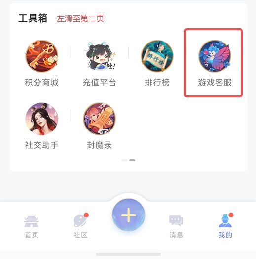 方式二:登录“掌上问道”APP,打开“我的”页面,“工具箱”区域左滑至第二页,点击“游戏客服”。