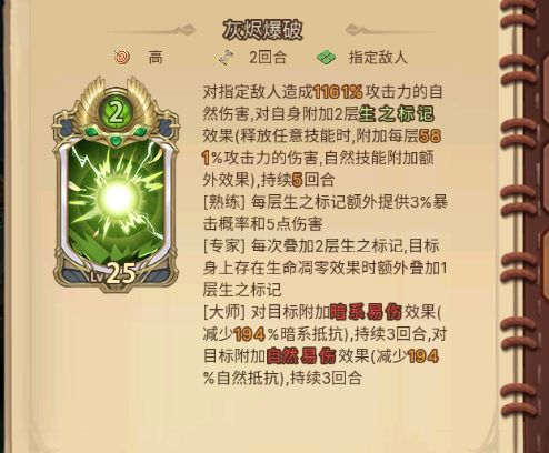 【生之标记】的来源是由灰羽的灰烬爆破增加到自身上的BUFF,[大师] 时可同时减少对方的暗系抗性以及自然抗性。当目标有生命凋零的时候,还能额外叠加一层,此为灰羽主要自然系伤害技能。