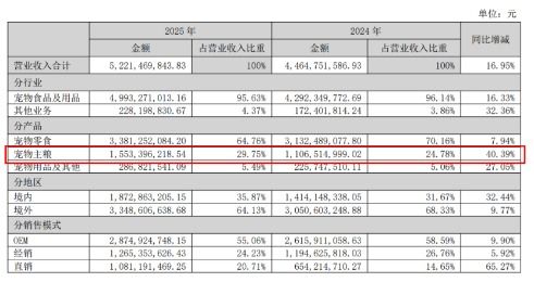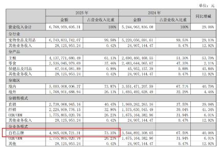 乖宝宠物旗下自有品牌正成为核心增长极,2025年自有品牌实现营收49.65亿元,同比增长40.06%,占主营业务收入比重提升至73.35%。