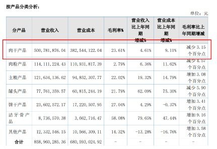 路斯股份仍以宠物肉干为核心产品,该品类全年收入5.01亿元,占总营收58.30%;罐头产品收入同比增长62.09%,为增速最快的细分品类。