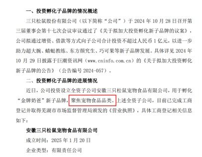 休闲食品领域,三只松鼠于2025年先后设立宠物食品全资子公司,推出“金牌奶爸”和“饿了个喵”两大宠物品牌,以“零食巨头”供应链优势入局宠物食品市场。