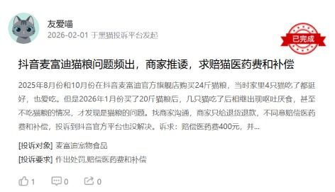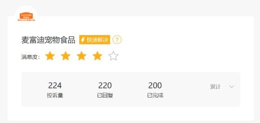 截至记者发稿,乖宝宠物旗下另一核心品牌麦富迪在黑猫投诉平台的累计投诉量达224起,已完成200起。涉及产品质量、售后处理不当等多类问题。