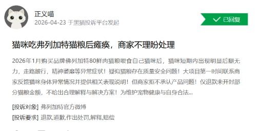 据黑猫投诉平台公开数据,截至记者发稿,针对弗列加特品牌的投诉达84起,已完成72起。投诉内容集中在宠物食用该品牌猫粮后出现后肢无力、瘫痪等神经性异常症状,以及产品包装封口不严、猫粮受潮结块、出现异物等品控问题。
