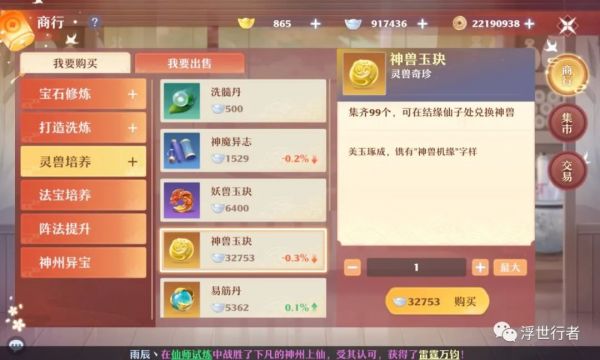 最后就是神兽拥有永生属性了,刷日常不消耗寿命,不需要额外的铜钱支出。一般的灵兽没有永生属性,进行一场对战会消耗1点寿命,如果在对战中死亡的话会额外消耗20点寿命,寿命低于50的灵兽将无法出战。而想要补充寿命除了在元宝商城购买金风玉露之外就只能在集市花铜钱购买了,而且很贵。