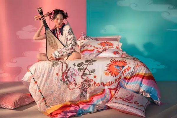 国货潮牌是一股新的消费潮流。追求个性与自我表达的年轻人,对中式美学的热衷度是非常高的,潮与传统并行不悖。比如罗莱家纺在今年设计了一款“星灵兽”床品四件套,图案很有意思,由带有中国神话特色的各种动物组成一幅仙境画面。这些艺术形象幻化成人形,手中抚着琴,在松柏与花卉之间,日月星辰流转,在床尾处拖曳出七彩祥云,有非常浓郁的中式美学风格。但仔细看,空间和人物造型又让人联想到文艺复兴时期的教堂穹顶壁画,这种中西方的碰撞体现出设计师天马行空的想象力。首席设计师陶丽秋针对这款设计说道,无论是中国还是海外,古代艺术与传统文化的价值越来越受到年轻消费者的认可。