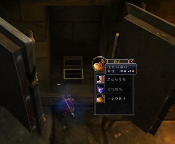 门后面是一个小宝盒,这个宝盒能开出来我们要的【黑铁幼婴鞋】,几率很低: