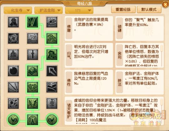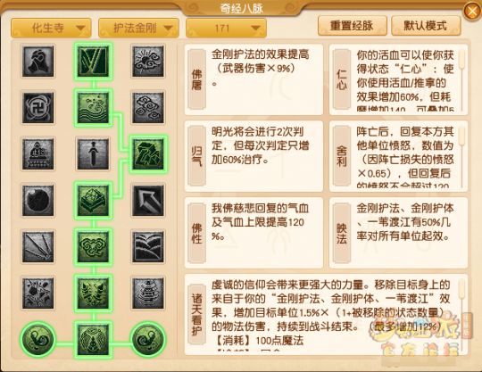 这套经脉流派适用的PK场合较少,只推荐在确定对方不会使用阴曹地府时使用。因为舍弃了【慈心】经脉,所以无法提前拉起中锢魂术或死亡锢咒的倒地单位。取而代之的则是【映法】经脉的10金刚效果,能够大幅度提升本方的物理攻击效果。