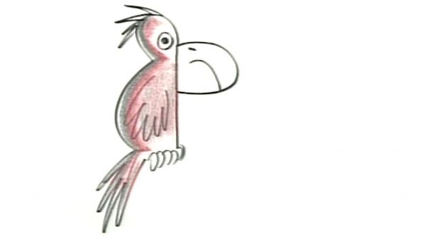 ③:接着画出向上再向下的弧线,这是它的头,紧接着弧线向下是他的身体。在底部画出它的羽毛,一排小小的脚;