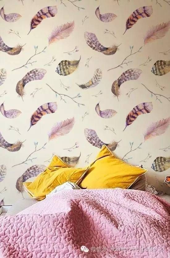 有色墙搭配彩色羽毛墙纸,再根据羽毛的颜色选择一些小物,一个房间立马生动起来了,又不会因为颜色多而显得复杂。