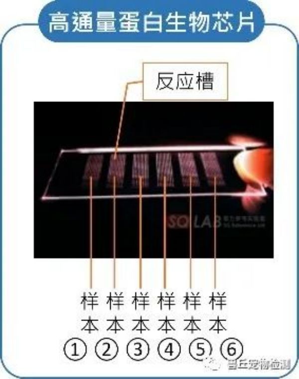 兽丘过敏原检测采用专用的蛋白生物芯片,即以微加工技术在平方厘米大小的固相介质表面构建的微型分析系统,可以实现在一张小小的玻片上同时检测多个项目与多个样本。兽丘过敏原检测超过100项特异性IgE。每项特异性 IgE 都有三个反应槽(三重复试验),同一项特异性IgE必须重复测三次,以确保数据的复现性、稳定性,同时每个芯片上均有质控对照槽,也必须重复检测三次,以确保检测数据的可靠性。
