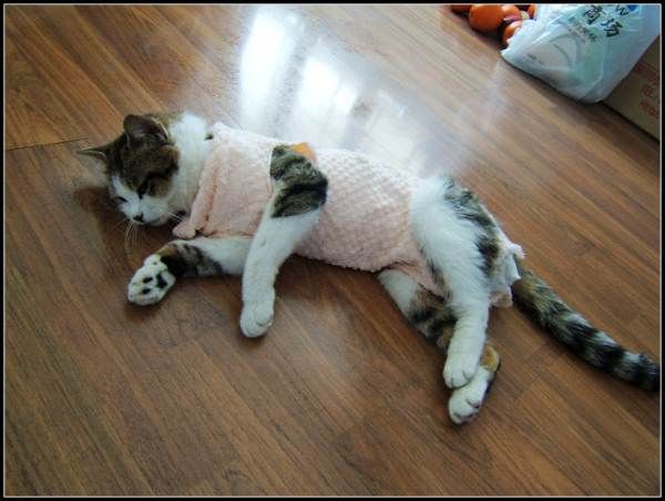对于术后母猫而言,最重要的就是保证其刀口在拆线之前没有感染、破损等意外发生。一定不要擅自除去医院对猫猫的原始包扎,可将自制手术服套在外面加以保护。
