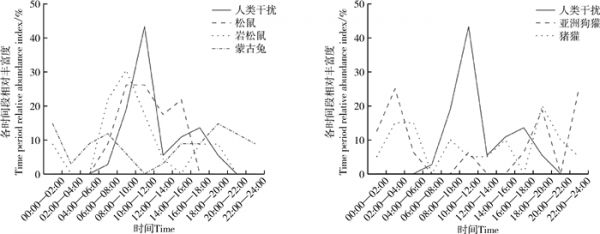 在低强度人类干扰区域内,松鼠、岩松鼠在人类干扰时段活动强度较高,均表现为不避开人类干扰高峰时段; 蒙古兔在人类干扰高峰时段活动强度最低; 亚洲狗獾、猪獾均以夜间活动为主(图 5)。