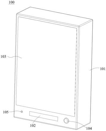 32.在一实施例中,参照图1,所述宠物排泄物清理工具的取用设备100还包括液晶显示屏103,所述液晶显示屏103设于所述壳体101上,所述液晶显示屏103与所述控制模块10连接,所述液晶显示屏103用于显示预设图像。其中,液晶显示屏103可以是普通电脑显示器液晶或者是强光液晶,针对室内和室外不同场所选择适用不同类型的液晶显示屏103。预设图像可以是公益广告,提醒宠物主人注意城市街道的卫生,还可以是商业广告。需要说明的是,在检测到宠物主人与宠物同时出现在同一图像时,预设图像可以显示为“提示取用清理工具”的图像。