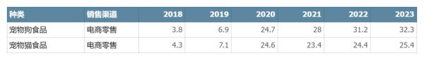宠物食品通过电商零售渠道销售的市场份额(单位:%)