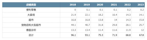 数据来源:Euromonito 从相关数据中可以看出,从2018年至2023年,通过线下渠道销售的宠物食品占比逐年下降,具体而言,宠物猫食品的线下销售份额从2018年的95.7%下降至2023年的74.5%。其中,大卖场和超市作为主要的销售点,占据了较大的市场份额。2021年至2023年,大卖场的销售份额分别为25.3%、22.3%和21.9%,而超市的销售份额则分别为21.3%、23.5%和21.7%。