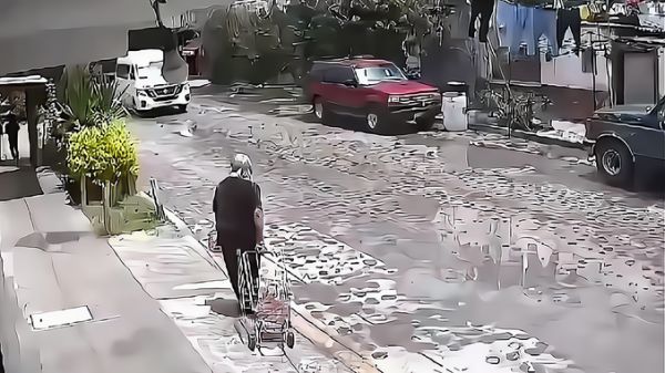 视频中的这位老人刚转过身准备去购物,结果几条疯狗拦住这名老人