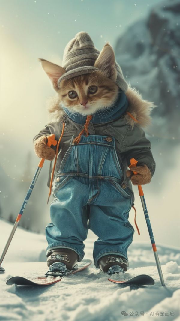 一只小猫身着潮流滑雪装备,在雪山上自信滑行。它的口袋里伸出小手,仿佛是在向我们炫耀它那宽松的蓝色牛仔裤和时尚的太阳镜。