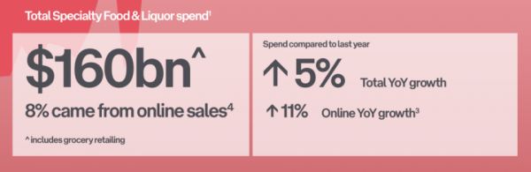 2022年,澳大利亚的特色食品/酒水类营收额达到1600亿美元,总营收同比增长率上升了5%,线上营收占比8%,线上营收额增长率上涨了11%。