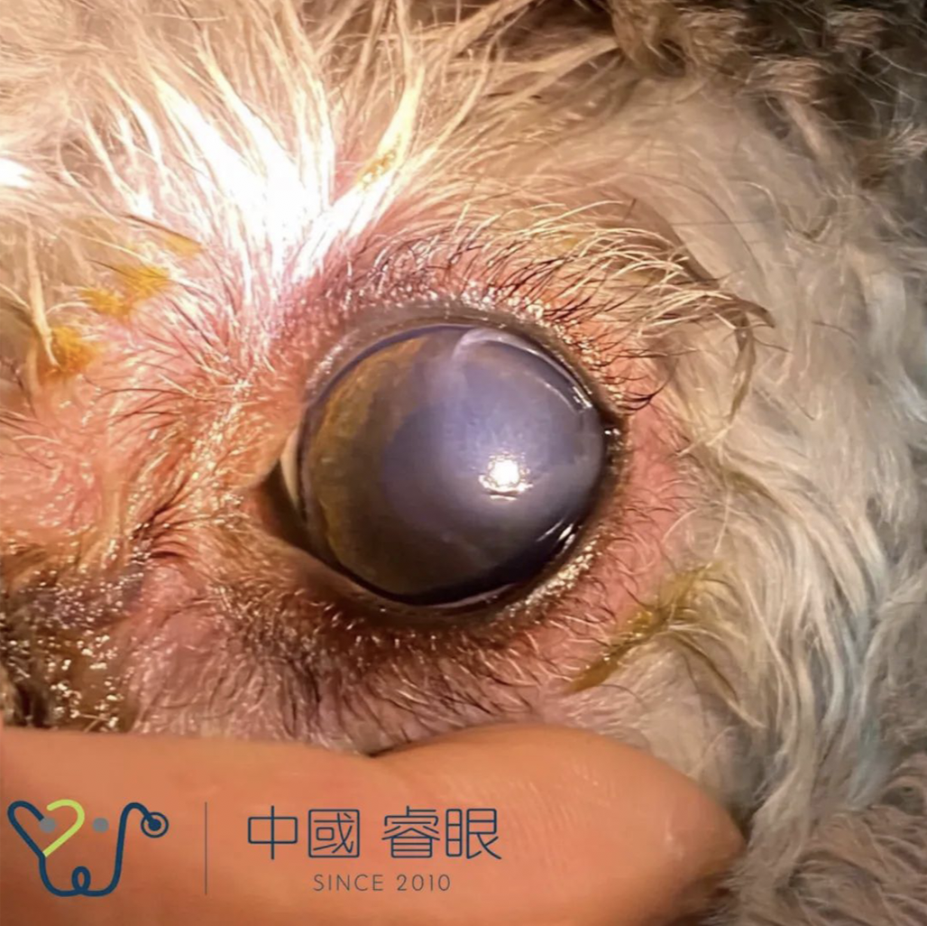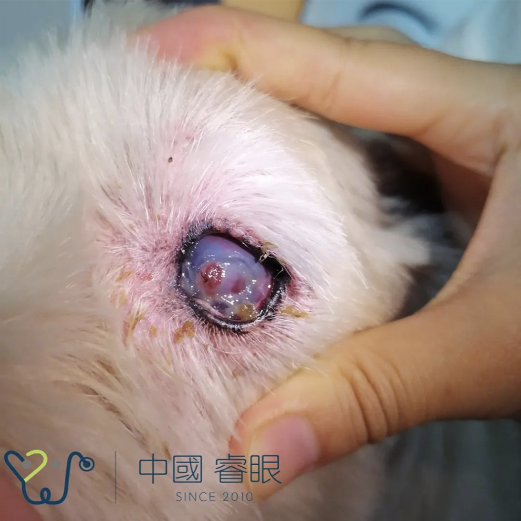 因外伤或严重角膜溃疡等原因使角膜全层缺损形成孔洞,眼内容物(常见房水和虹膜等)从孔洞处向外涌出。宠物往往因强烈的疼痛导致无法睁眼,无法看见外面的世界。