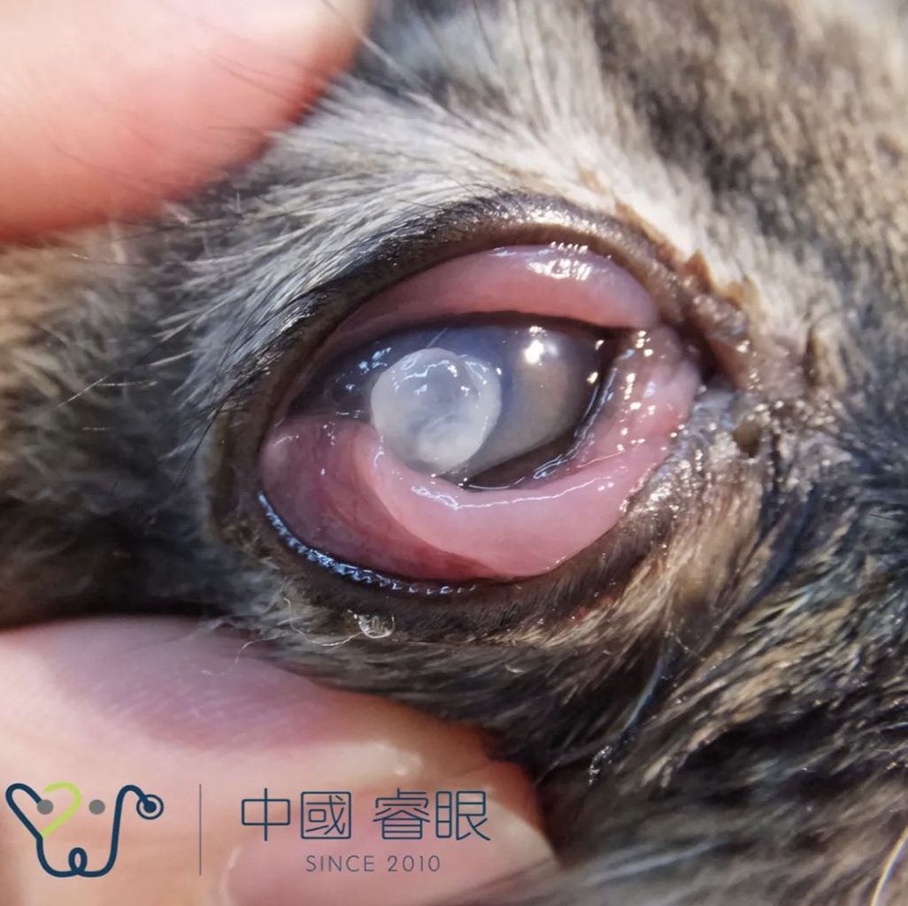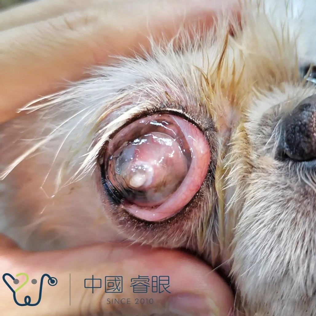 病因:角膜溃疡恶化、外伤、白内障晶体前脱位等。表现为角膜表面凸起小泡或眼内容物脱出、大量房水(液体)渗出。