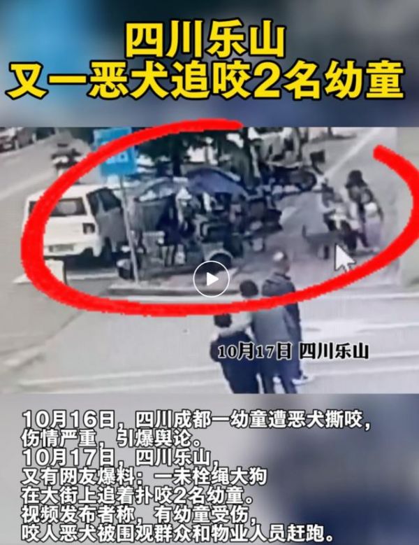 同样去年,四川乐山,有网友爆料:一未拴绳大狗在大街上追着扑咬2名幼童。视频发布者称,有幼童受伤,咬人恶犬被围观群众和物业人员赶跑。