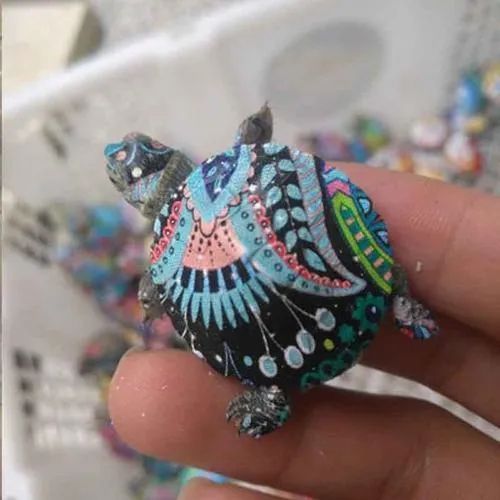 这一般选用的都是刚出生的小乌龟,在龟壳上进行喷绘,涂上各种防水颜料,这样很容易使甲壳受损溃烂导致患“腐甲病”和“翘甲病”,无法通过晒太阳进行钙质转换,很快就会死亡。