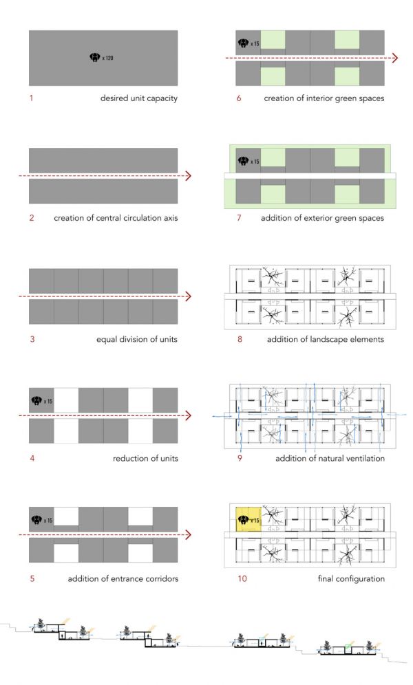 庇护所沿场地南北两侧布置,由中央区隔开,中央区包括一个露天剧场、行政单位以及小狗和纯种犬庇护所。兽医服务单元、检疫单元和攻击性犬只收容所位于场地东端。这些收容单元是该项目的基础,其设计旨在解决许多收容所面临的卫生、安全、无障碍和缺乏绿色空间等问题,并提供开放和舒适的空间,包括由绿色和泥土区域组成的软景观,进一步将该项目与周围景观融为一体。