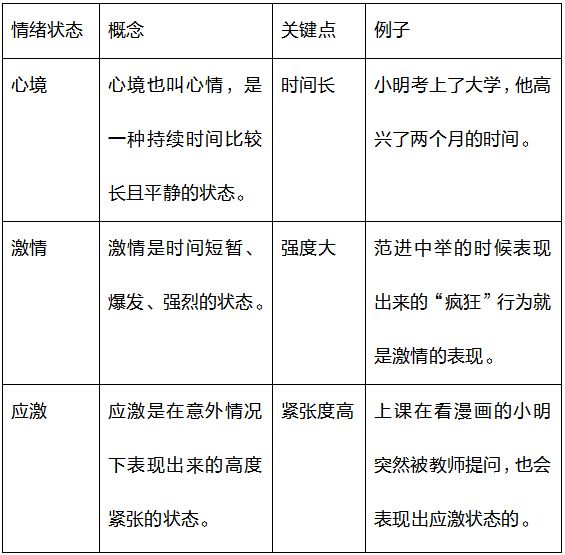 1.情绪:个体在个其需要是否得到满足的时候产生的心理体验和相应的反应。例如,我们感觉寒冷的时候,有人送来一条毛毯,就会产生满意、愉快的心理体验。基本的情绪有:喜、怒、哀、惧。这是人和动物所共有的,当我们的宠物狗饥饿却吃不到食物的时候,它也会产生愤怒的情绪。