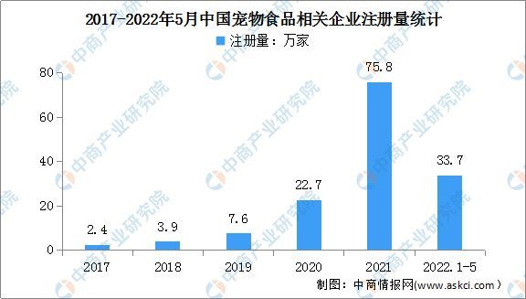 近年来,随着宠物及宠物食品行业景气度的持续提升,宠物食品相关企业注册量快速增长。数据显示,我国宠物食品企业注册量由2017年的2.4万家增至2020年的22.7万家。2021年新增企业快速增长,新增企业数量达75.8万家,为近年峰值,同比增长235.0%。最新数据显示,2022年1-5月,宠物食品新增相关企业33.7万家。