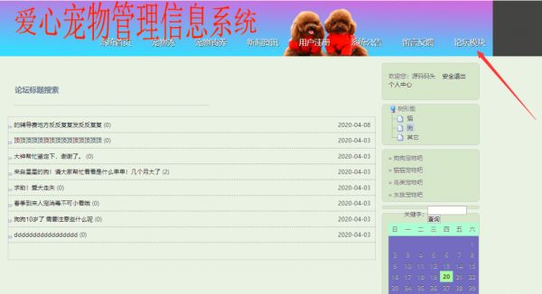 发布宠物信息,寄样信息管理,新闻资讯管理,用户管理,留言管理,管理员登陆,类别管理,系统公告管理,论坛版块管理,领养管理等功能。