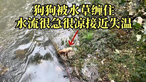 河边发现被水草缠住的狗狗,呼救声凄惨,水流很急也很凉情况危险
