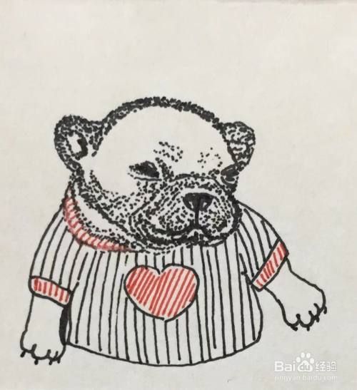 我们用笔画出狗狗的身体轮廓和服装。在服装袖口处画出法斗犬的前肢,红色勾线笔画出服装上的装饰图案。