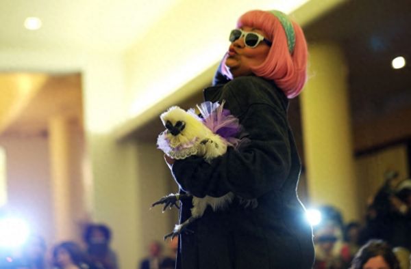 新华社照片,法新,2016年2月12日(法新)(1)宠物时装秀2月11日,在美国纽约举行的一个宠物时装展上,一名女子抱着她的宠物鸡登台表演。新华社/法新