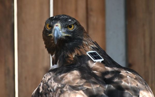 北京猛禽救助中心在放飞康复的金雕前,在救助中心为其戴上了GPS追踪器。受访者供图