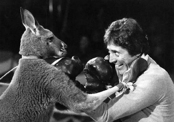 澳大利亚经典的拳击袋鼠,它曾是19世纪末和20世纪初各地杂耍节目的特色。袋鼠戴上手套以保护人类拳击手免受锋利爪子的伤害。