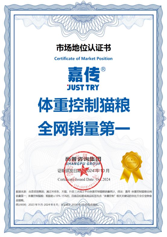 市场地位认证:嘉传荣获“体重控制猫粮全网销量第一”