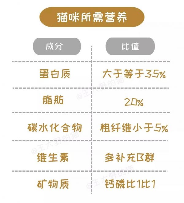 猫咪是肉食动物,对蛋白质的需求很高。猫咪需求的营养成分比例中,蛋白质占比35%,脂肪占比20%,剩下的45%才是碳水化合物。而人类的脂肪占比仅有14%,蛋白质占比18%,碳水化合物占比68%。