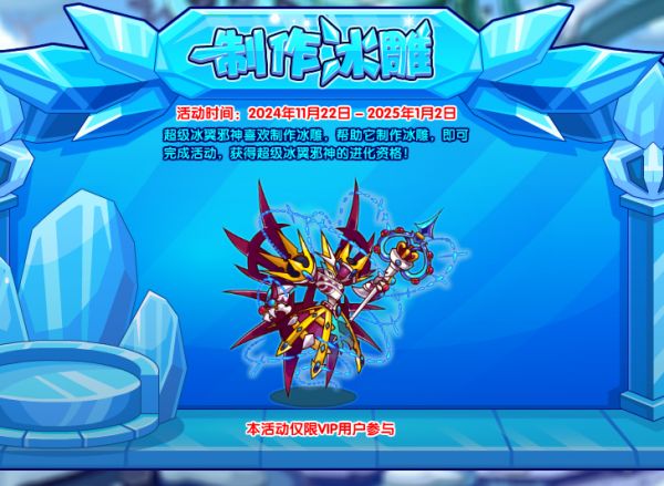 超级冰翼邪神喜欢制作冰雕,帮助它制作冰雕,即可完成活动,获得超级冰翼邪神的进化资格!(本活动仅限VIP用户参与)