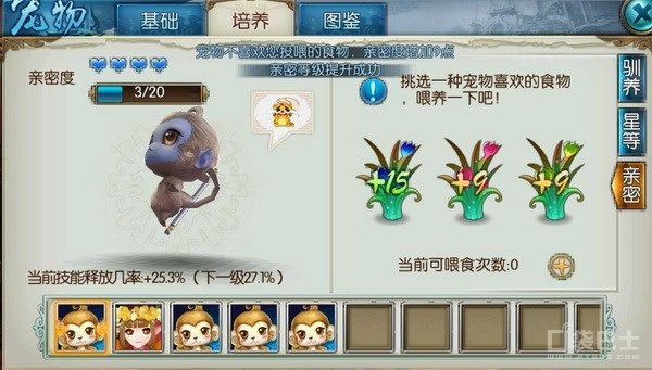 亲密度可以左右宠物释放技能的几率,所以当你的宠物有一身好技能后没有亲密度也无法在战斗中发挥全部实力,提升亲密度的方法很简单,点击屏幕右侧的三朵花即可,如果恰巧挑中了宠物喜爱的花露那么宠物将提升15的亲密度,如果没有选中则加9,比较坑爹的是这完全是随机的,不要尝试记住某种宠物的喜好。额外花露喂食机会10元宝一次,花露所有宠物共通,所以不要妄想每只宠物都喂一遍。