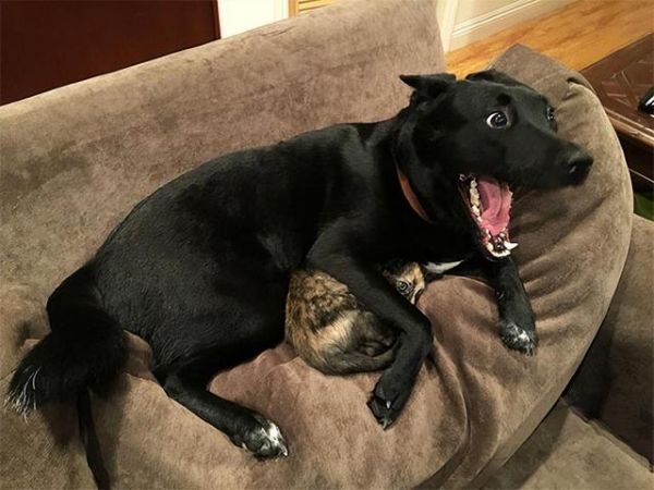10. 狗原来害怕猫,她躲到沙发角落,一眼都不敢看它。